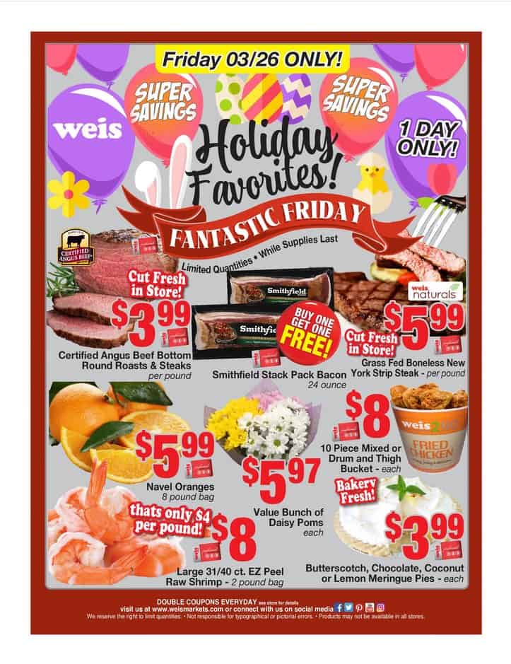 Weis Markets Circular and Weekly Ad Specials Weis Flyer. Strawberries, Blueberries or Blackberries. Weis weekly specials: B1G1 free Strawberries - 16 oz, Blueberries - pint or Blackberries - 5.6 oz; $1.29 per pound Smoked Ham Portions; 50% off per lb Perdue Savings Pack or Fit N' Easy Boneless Chicken Breast; $1.99 Selected Bigelow Tea - 20 ct; $1.47 Weis Quality Grade A Large ... Weis Markets Coupon Group - Facebook Weis Markets Coupon Group Private group · 22.1K members Join group About this group Deals for Weis Markets **GROUP Rules*** This group is run by Forthemommas.com. Please do not post links to other coupon sites or blogs. Do no … See more Private Only members can see who's in the group and what they post. Visible Anyone can find this group. General MyWeis | Living Rich With Coupons® Weis Coupon Policy. Print the Weis Coupon Policy:. Weis Markets offers Double Coupons in select locations to our customers, amount doubled varies by store. Weis Markets will double up to four (4) of the same coupon.